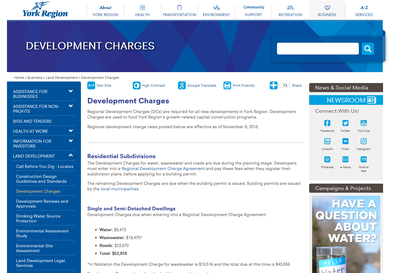 Every municipality is hungry for revenues, and with every new house built there will be development charges, and even for a single detached house the fees, depending on the municipality, can be very high. York region for example has increased their development charges to $52,818 per unit and this is just the beginning, you will still need to worry about connecting hydro, gas, water, road (if applicable), in total this can set you back $100,000 or even more before you even apply for a permit.