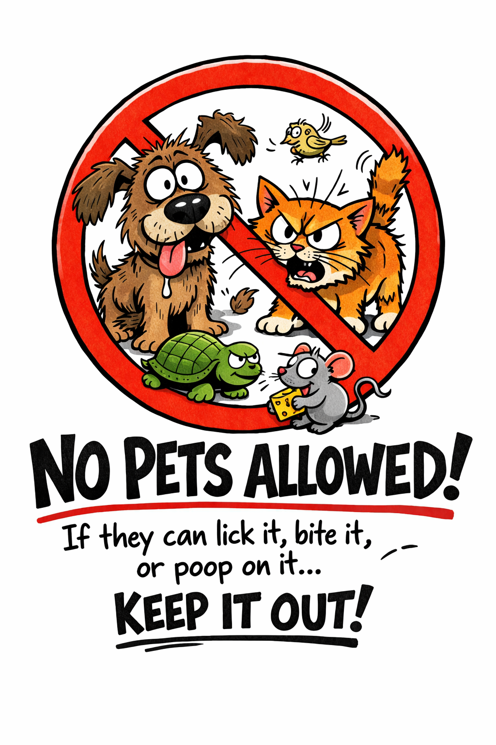 - No animal, livestock, reptile or fowl other than a pet such as caged bird, fish, cat or dog.
