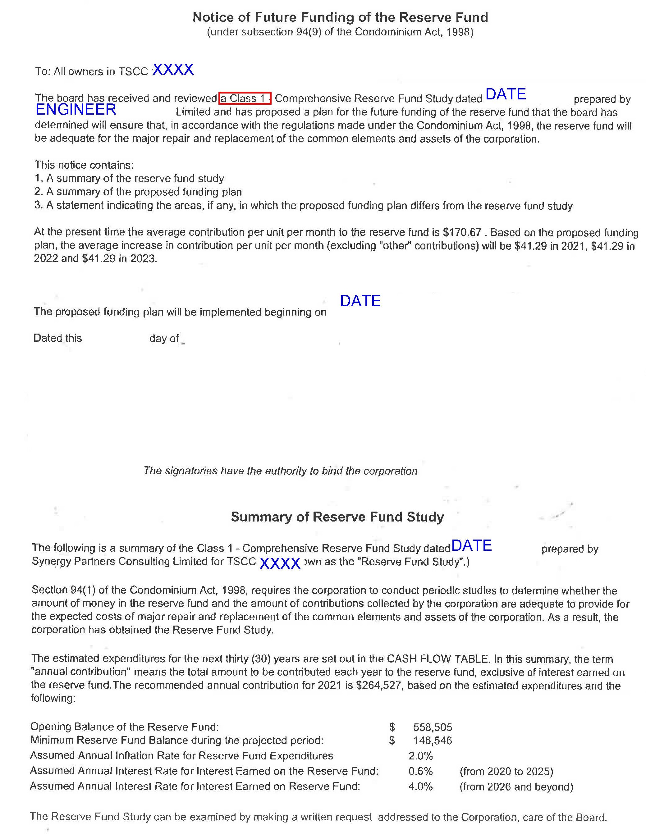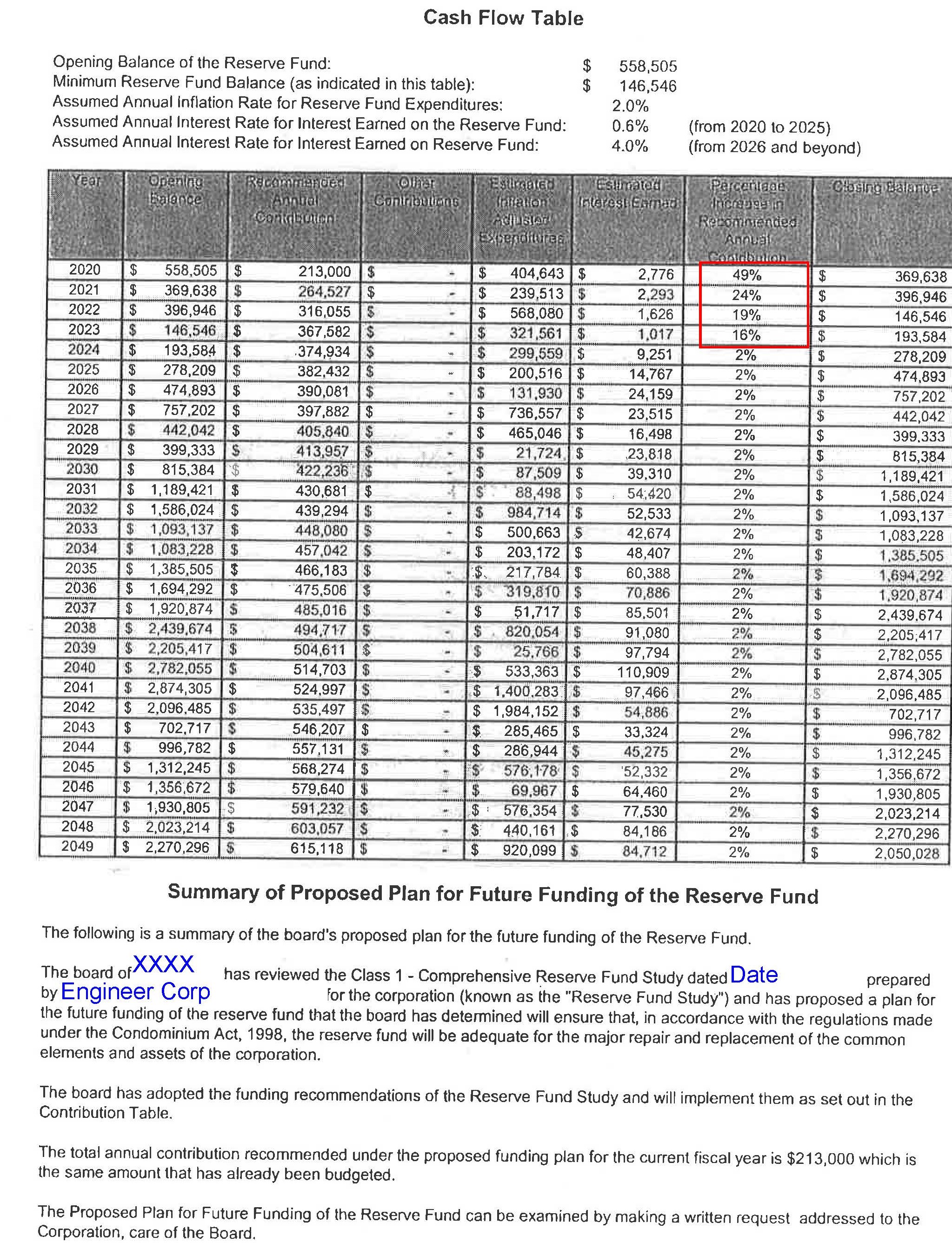 As part of the Form 15 you will likely see few pages and tables, it will describe who prepared the report, for which corporation, when, what would be the average monthly contribution and increase to the reserve fund, the pages have some interesting and highlighted items we would like to point out.