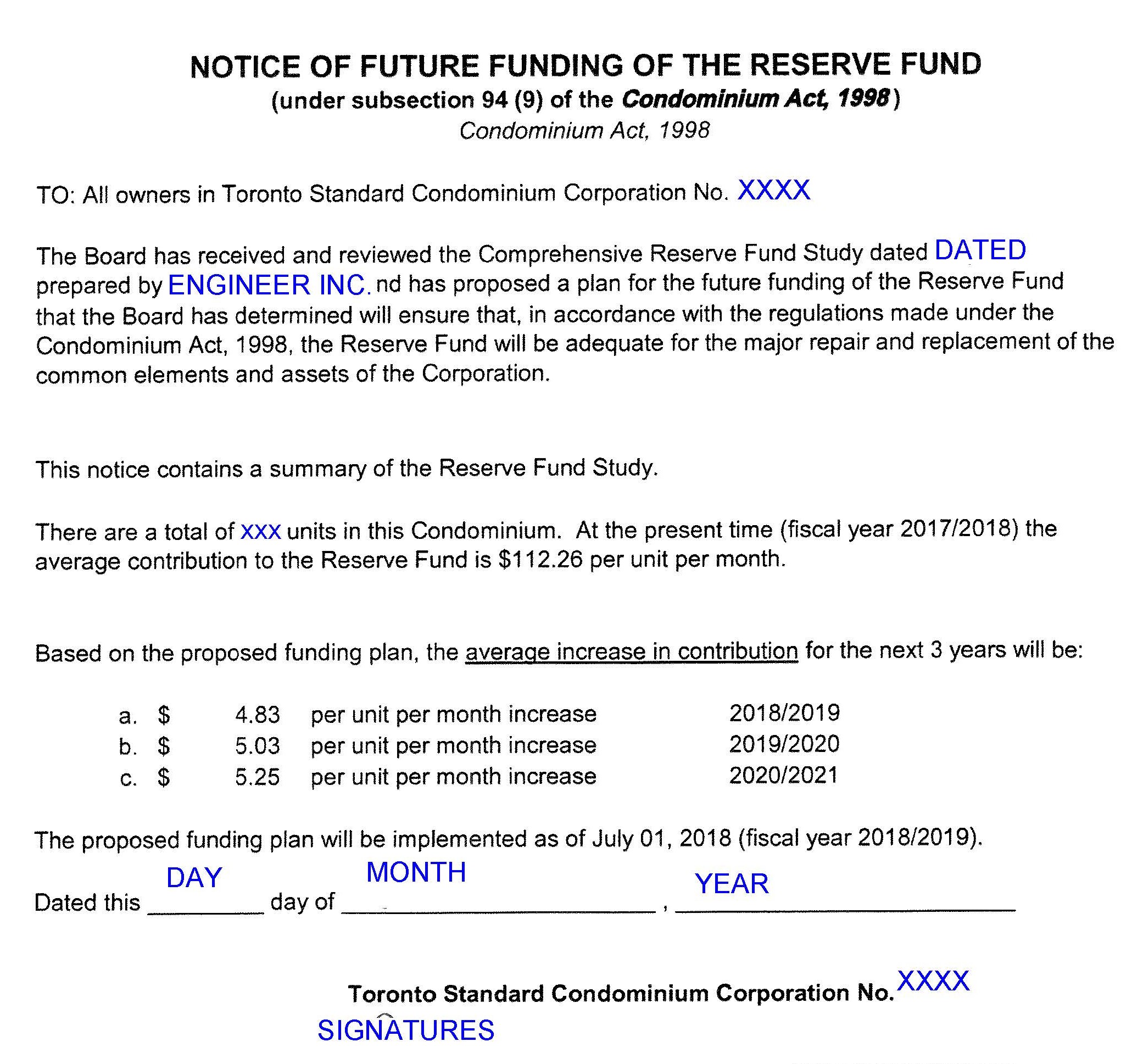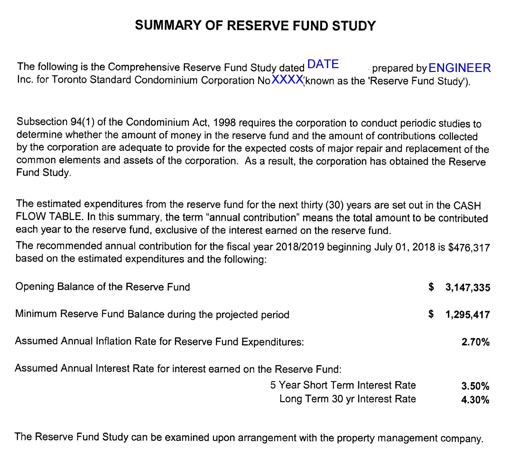 The reserve fund study document is complex and in-depth, it includes the background information on the corporation, it’s description, inspection report with itemized overview of the major components, information tables summarizing the life expectancy, age etc of the common elements. However in the status certificate package you will only see the summary and expenditure and cashflow tables. These tables will show you the recommended funding plan for the 30 years in the future and it is included in Form 15.