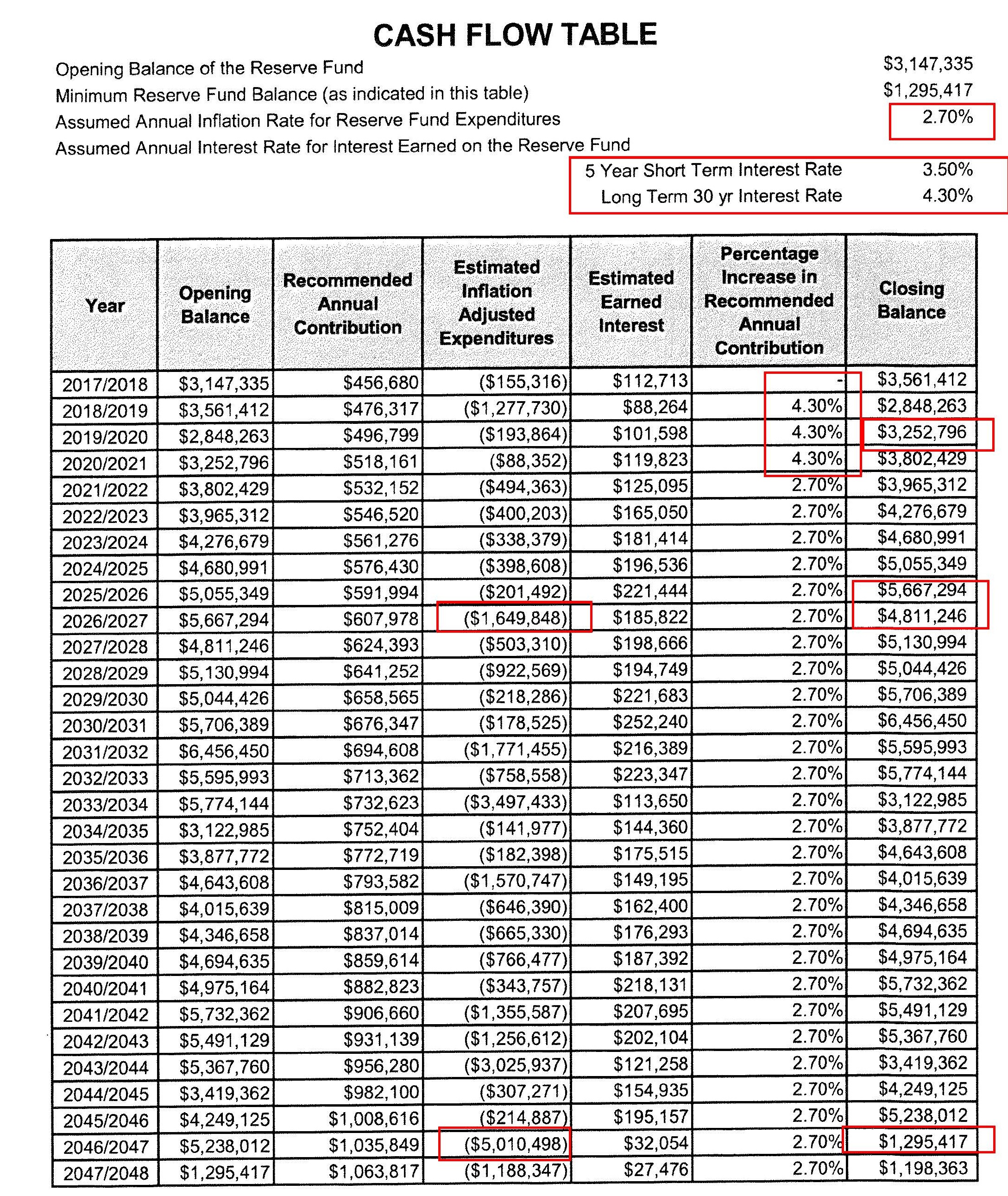We can start with the estimated annual inflation rate of 2.7%, this is obviously an estimate that will not hold through, the inflation could be quite a bit lower, or quite a bit higher, if the actual inflation rate deviates quite a bit from the estimate, the next reserve fund study done in 3 years will revise all the figures going forward.